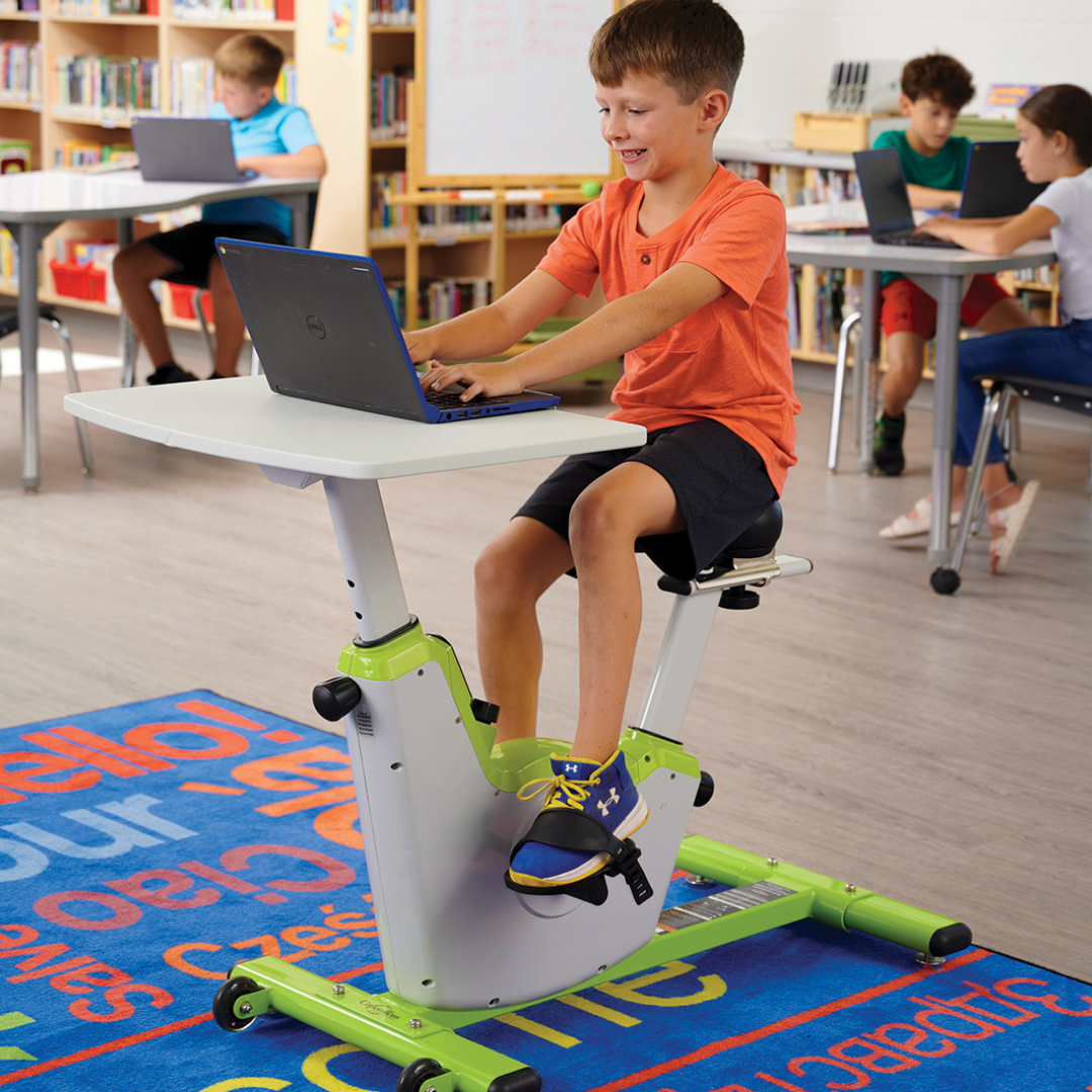 Numerous studies show that when students are allowed to have even short bouts of physical activity, learning outcomes and wellbeing improve. Our Self-regulation Classroom Pedal Desk with a large desktop is specifically for classrooms and ergonomically designed for riding comfort and fit of students in grades PreK-6. It is ideal for inclusive environments and helps kinesthetic learners and any student who needs to get the wiggles out so they can refocus and engage in learning. In just a ten-minute ride, students can become more engaged and ready to learn. What sets this pedal desk apart is its quiet drivetrain, full adjustability, and it is low maintenance. The large desktop makes it suitable for a wide range of activities, and with over 7 million testing cycles, this pedal desk is built to last! Two models are available to accommodate PreK-2 or Grade 3-6 students.