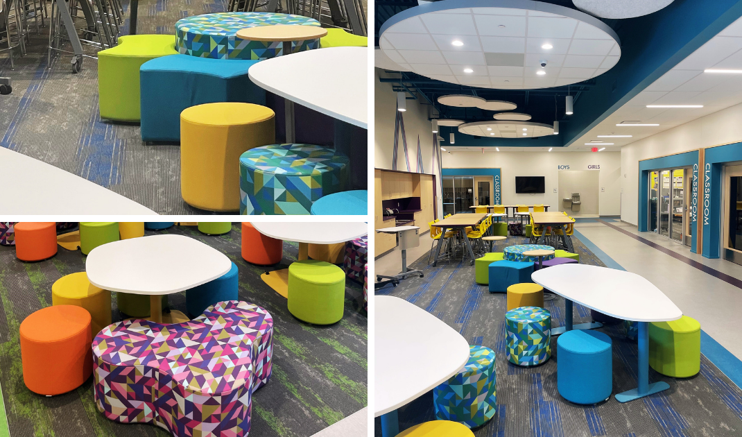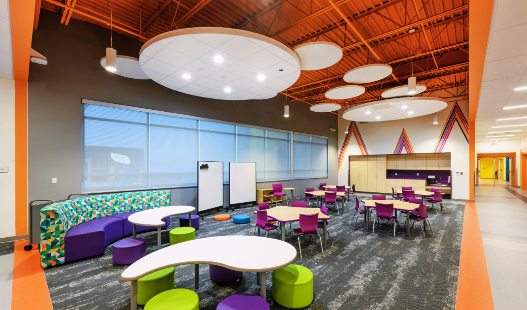 Color is integral to the interior design, with each grade wing defined by a primary color and a unifying purple accent throughout. Color not only aids in wayfinding but also gives each age group a sense of identity, while bold graphic wallcoverings tie the spaces together, fostering a colorful and welcoming atmosphere. Each wing is thoughtfully tailored to meet the needs of its students. Collaborative spaces support up to two full classes, encouraging social interaction and group learning. Classrooms across Brownfields Elementary incorporate flexible, student-centered furniture that is age-appropriate and allows teachers to reconfigure seating as needed.